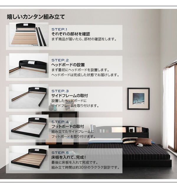 照明・棚付きフロアベッド ROSSO ロッソ 国産ポケットコイルマットレス付き シングル レギュラー丈