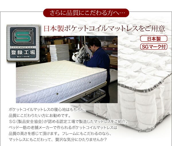 このベッドには、国産の高品質なポケットコイルマットレスが付属しており、身体をしっかり支える快適な眠りを実現します。さらに、広々とした収納スペースを備えており、大切なアイテムをスッキリと整理できるため、限られた空間を有効に活用できます。便利なコンセント付きデザインは、スマートフォンやその他のデバイスの充電も簡単に行えるため、現代のライフスタイルに理想的です。また、ベッドサイドの照明が、心地よいリラックスタイムを演出し、夜の安らぎを一層深めてくれます。