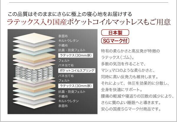 このベッドには国産の高品質なポケットコイルマットレスが付属しており、身体をしっかり支える快適な眠りを実現します。さらに、広々とした収納スペースを確保しており、大切なアイテムをスッキリと整理できるため、限られた空間を有効に活用できます。便利なコンセント付きデザインは、スマートフォンやその他のデバイスの充電も手軽に行えるため、現代のライフスタイルに理想的です。また、ベッドサイドの照明が、心地よいリラックスタイムを演出し、夜の安らぎを一層深めてくれます。