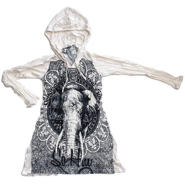 ゾウさんプリントがエスニックなクリンクル加工長袖フード付きチュニックカットソーです。
