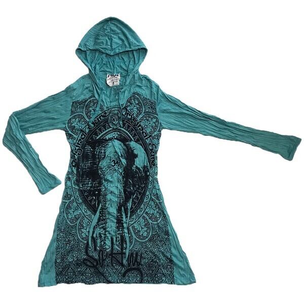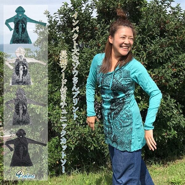 ゾウさん プリント フード付き 長袖 チュニック カットソー クリンクル加工 ロンT アジアン エスニック